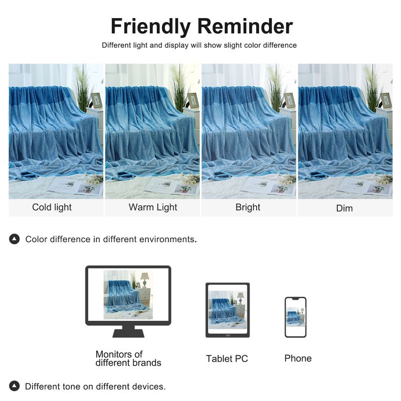 Compare to the other pure color blanket, this flannel fleece blanket enfolding gradient color elements, make it more spirited instead of drab. Features: 1. 100%  microfiber polyester, a breathable fabric, wrinkle and resistant, not easy pilling, not easy to loose hair. 2. High fabric weight and density, 300 GSM, make this blanket has good warmth retention property. 3. Double-napped processing, give you soft feel in touching. 4. With the finest edge covering craft, long lasting. 5. New-generation reactive dyeing technology has the feature of bright color and color stability, no stimulation. 6. Available in 9 colors and 4 sizes, being able to meet the needs of different people. 7. Machine Washable. Stay new after wash and wash. Easy Wash and Care: Machine Washable. Choose the neutral , don’t soak more than 30 minutes, avoid wash this blanket with deep-color fabric. No bleach, do not iron, avoid exposure to the sun. Note: 1. Variability of 2-3 cm is possible due to the measurement process. 2. The image is generated electronically, product color may vary due to photographic lighting sources or your monitor settings.