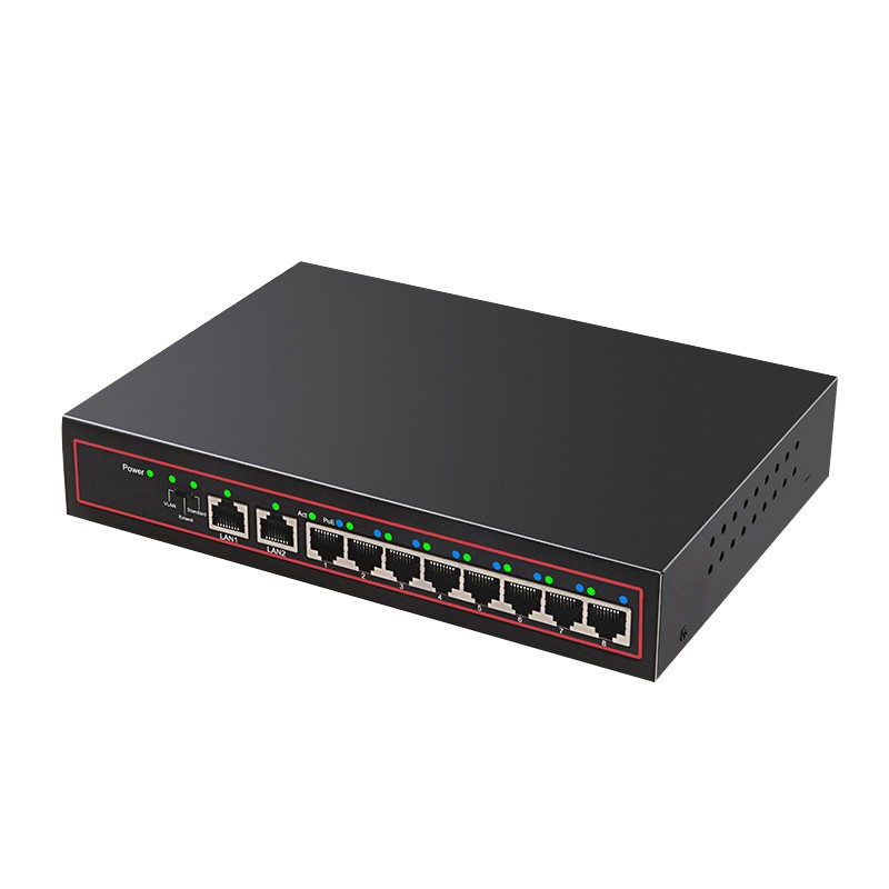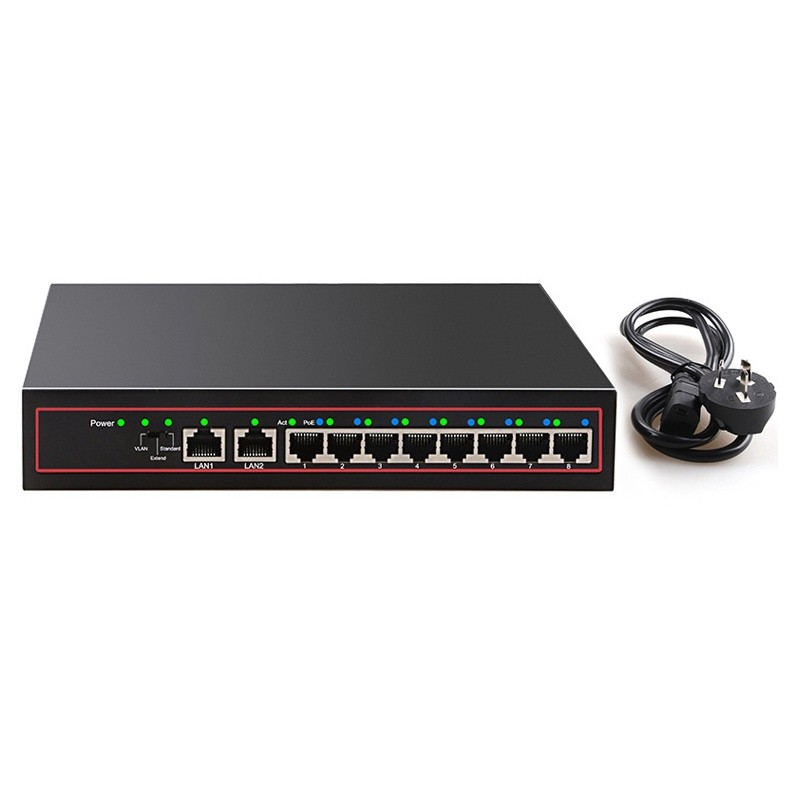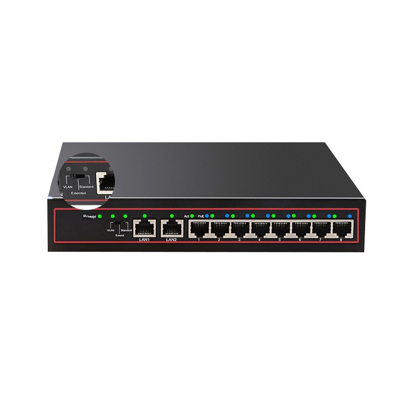 Features:? 1. 10 Port POE switch, support 8 pcs 500W? Pixel cameras, transmission distance up to 250 meters. 2. POE chip amp; short circuit protection amp; steady voltage amp; lightening protection grounding. 3. 100 trillion uplink amp; series application amp; heat dissipation performance amp; single port high power.? 4. VLAN one-touch switch.? -When VLAN switching, 1 to 8 port could not communicate with each other, they just could communicate with LAN1 or LAN2, it implement port isolation. Suppressing network storms and improving network security.? - When VLAN cut off, 1 to 8 port could communicate with each other. 5. POE Switch connecting, it could connect 8 cameras or wireless AP.??