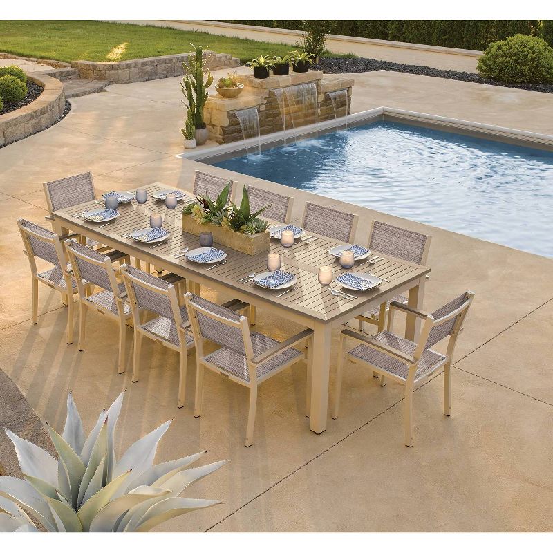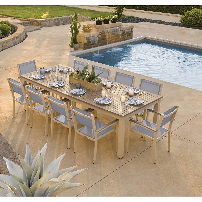 This modern, mixed-material 103" Rectangular Dining Table combines classic styling with a contemporary appeal. With a variety of material and finish options, Travira is sure to make a bold statement. No matter the application, this table is perfect for everyday use in commercial and residential settings. Fabricated using lightweight, low-maintenance, durable powder-coated aluminum and Tekwood, one of the most authentic looking wood-alternative products on the market, this dining table is perfect for large group dining.