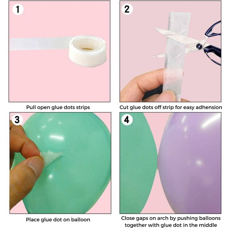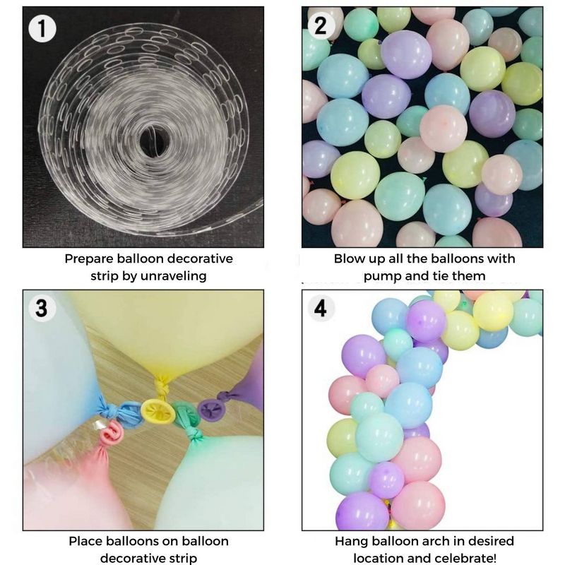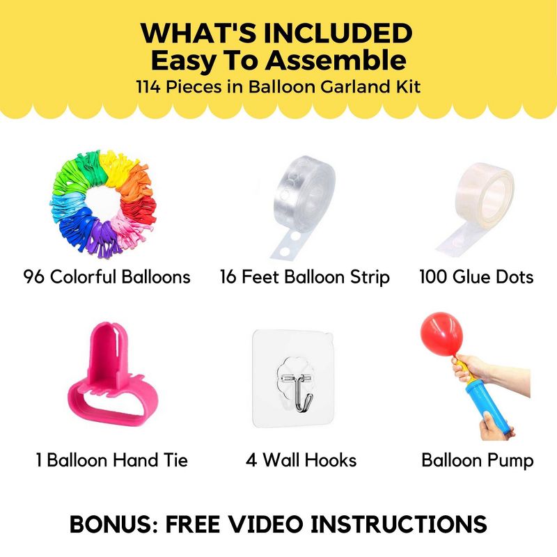 •INCLUDED: 96 colorful latex balloons, 100 glue dots, 10 feet garland decorative strip with balloon holes, 1 balloon tie tool (to make balloon tying easier), 1 hand pump, 3 wall hooks, 1 roll of string to hang arch, step-by-step print and video instructions.