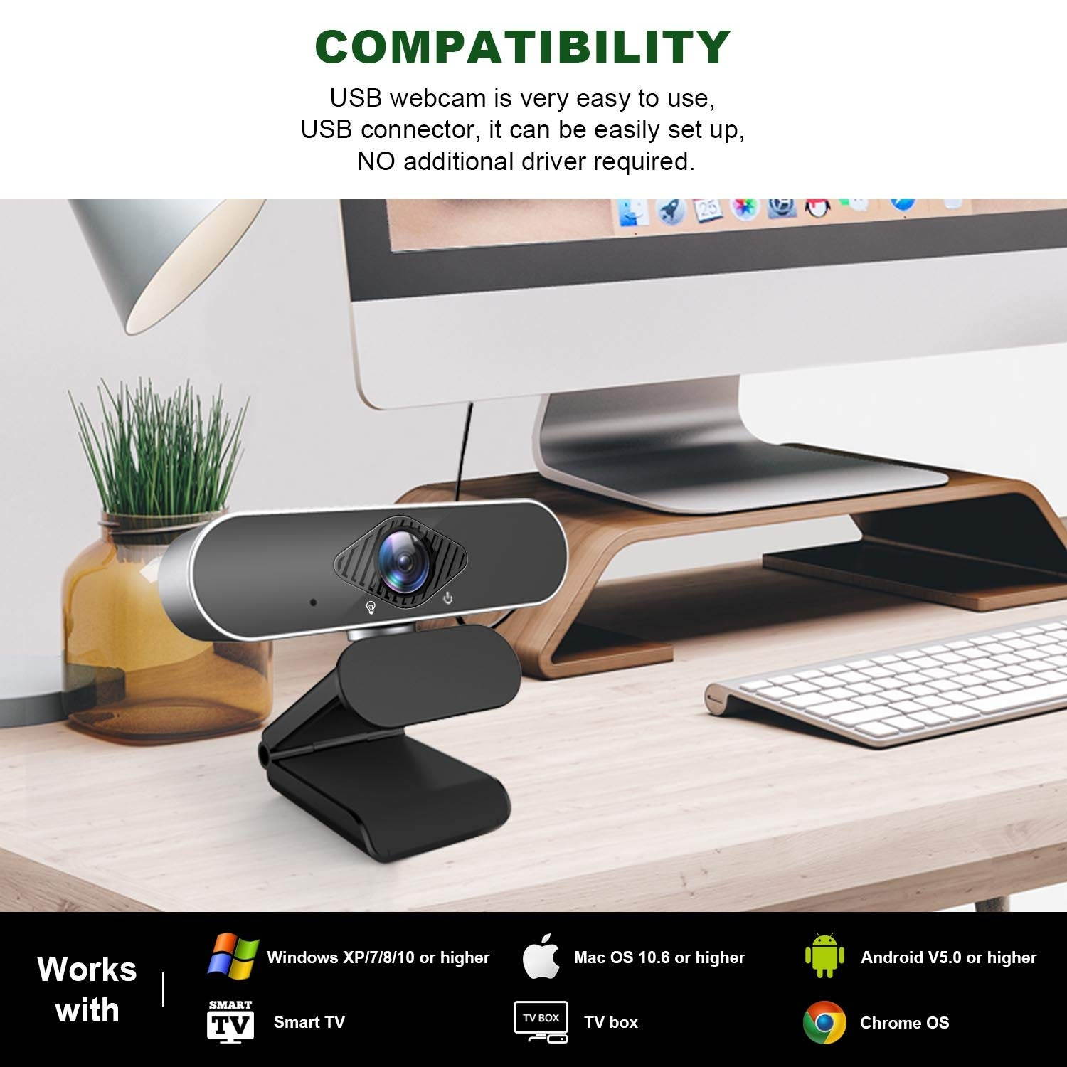 ?Plug and Play?This camera can be plug and play, no need to install any driver, can connect to Windows 7, Windows 8, Windows 10 or later, Mac OS 10.10 or later and Chrome OS via USB2.0 . Use Facebook Live, Google Hangouts, FaceTime, YouTube, etc.