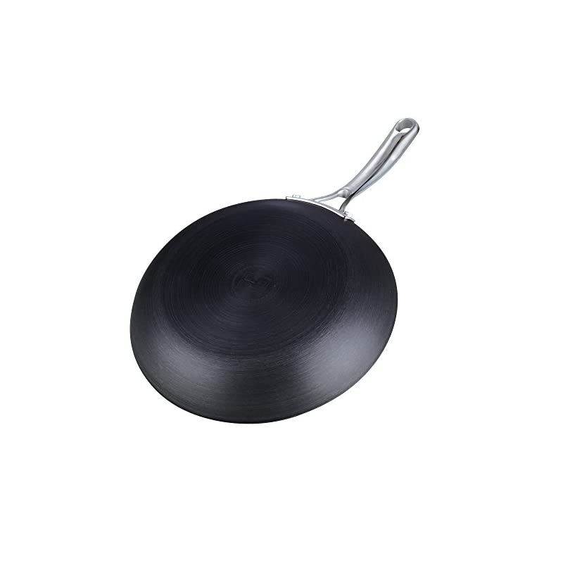 Size: 11-inch The 11-inch nonstick hard anodized fry saut omelet pan, Black has a hard anodized surface that is durable, thick, and harder than stainless steel. The heavy gauge aluminum core distributes heat quickly/evenly and prevents hot spots. Nonstick coating delivers exceptional performance, makes food release/cleaning easy, and allows for healthier cooking. Lead, cadmium, and PFOA free. Long stainless steel handle stays cool/comfortable and is riveted for strength. Flat and wide bottom for a large cooking surface. Sloped sides for tossing and holding more food. Works on gas, electric, glass, ceramic, halogen, etc. Oven safe to 450F. Not induction compatible. Dishwasher safe, hand wash recommended.