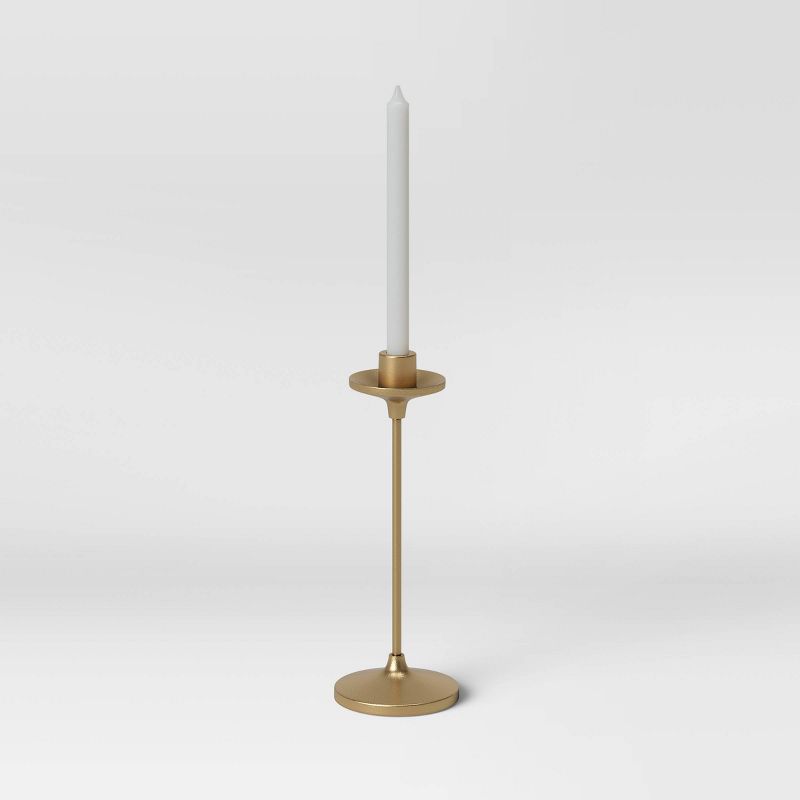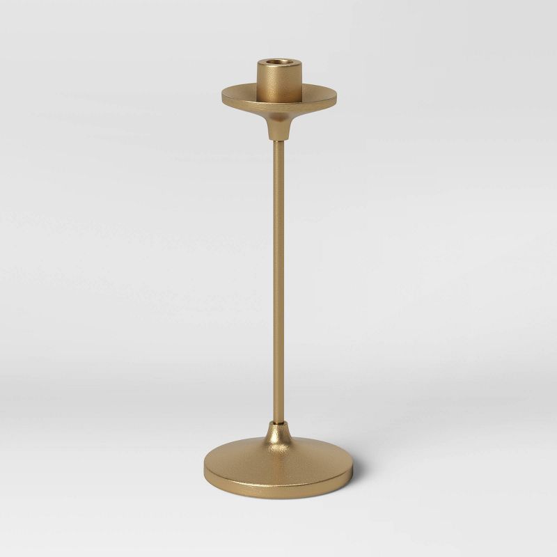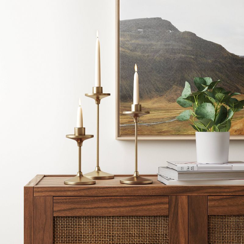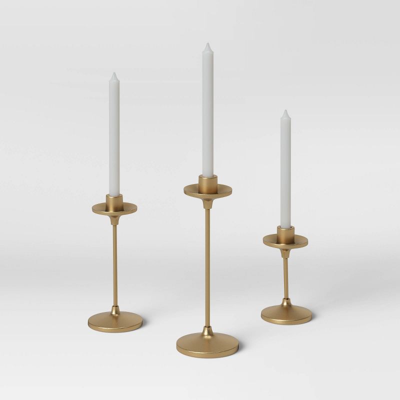 Create a glowing setting anywhere around your home with this Set of 3 Tapers Cast Aluminum Candle Holders with Brass Finish Gold from Thresholdâ„¢. Made from metal, this set includes three candle holders in slightly varying heights to brighten up your dining table, entryway console table or fireplace mantel with a stylish, sophisticated look. Boasting a sleek and shiny design with round base and top to help catch wax drips when candles are lit, these gold-finish candle holders will look great in a variety of spaces in your home.