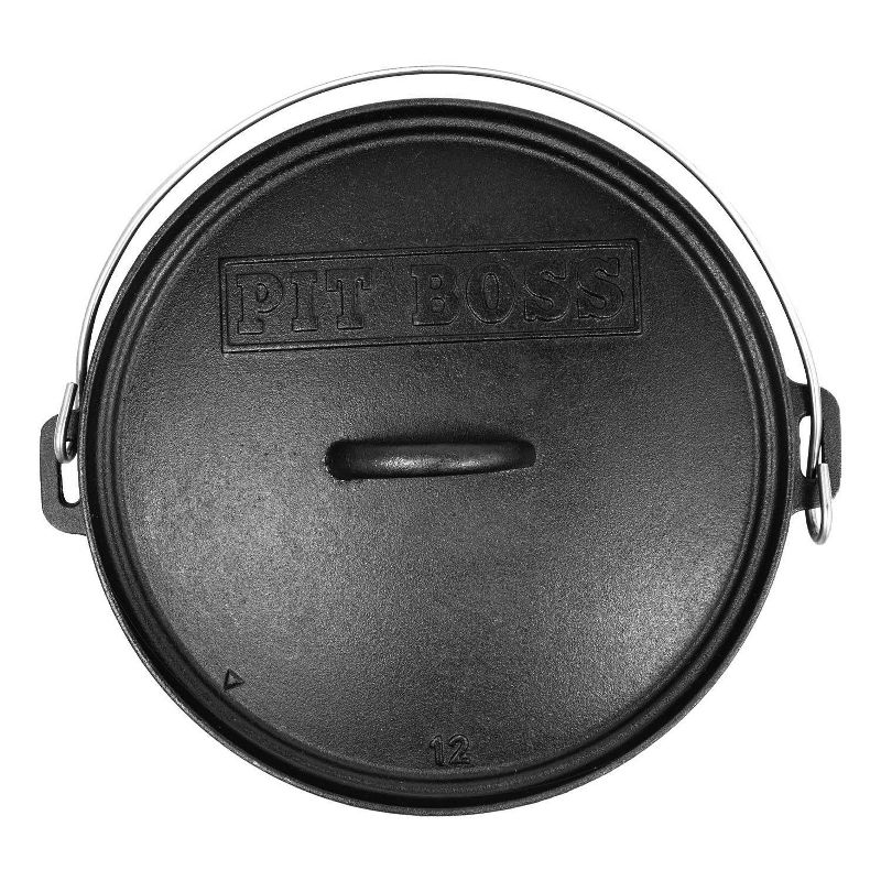 The Pit Boss Cast Iron Dutch Oven is pre-seasoned and ready to use right out of the box. The kettle holds 6 quarts, has a 12” diameter, can easily accommodate recipes for 10. It has built-in side handles, a looped lid handle, and a built-in thermometer notch with a lid arrow so you can insert use a thermometer while keeping the lid closed.