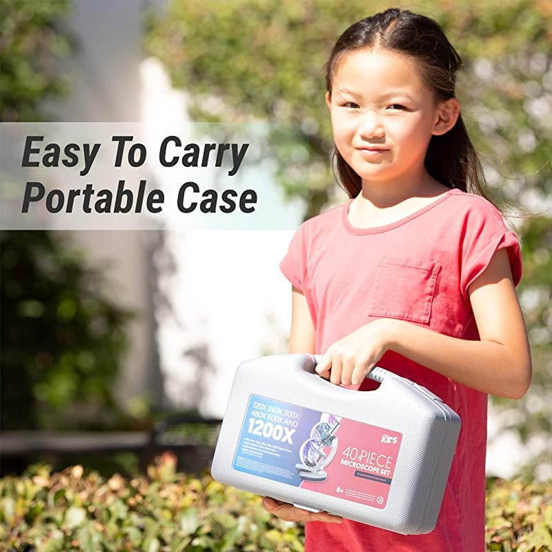 ***** **********Best Quality Guranteed. *****40-piece beginner biological microscope kit offers 120X, 240X, 300X, 480X, 600X and 1200X magnifications*****Durable metal arm with stage, clips and rack and pinion focusing*****Built-in LED electrical illumination and reflecting mirror for natural illumination*****Built-in rotating color filter wheel and power indicator on rotating turret*****The book - The World of The Microscope and two AA batteries included