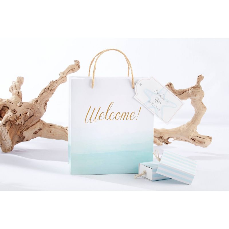 Welcome guests to an event or say "welcome" to a new homeowner with the 12-Count Beach Tides Welcome Gift Bags from Kate Aspen. "Welcome" is spelled out in golden script on a white bag with blue tide-like accents. The beach-themed gift bag is perfect for hiding away a present from prying eyes. Just finish it with tissue paper and you'll be ready for almost any gathering.