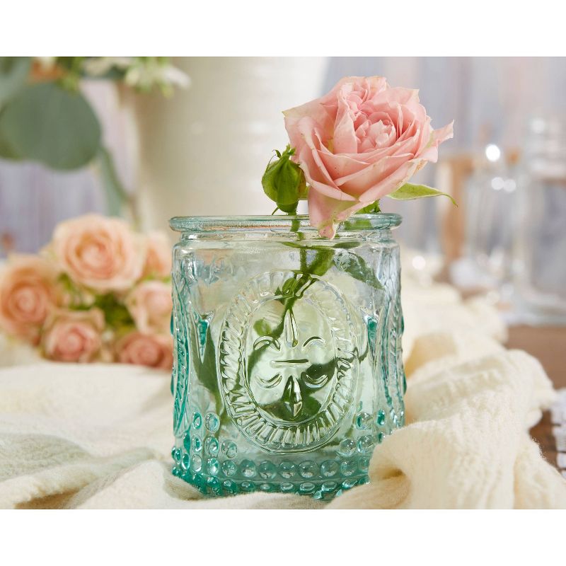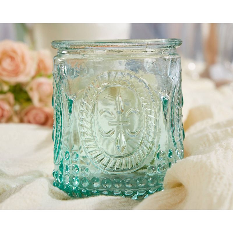 •Reminiscent of heirloom-quality, embossed, aqua colored glass