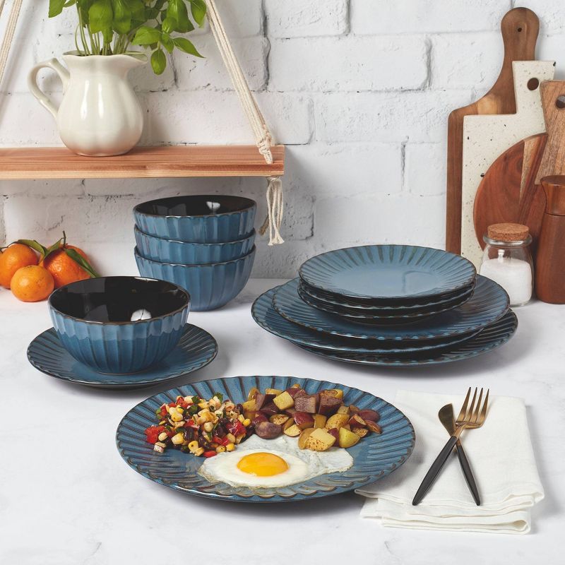 The round flat body with elegant ruffles skirted along the exterior rim of the plates and the hint of color highlights and lowlights in the reactive glaze makes for a mesmerizing dinnerware set for the table. This collection comes in 3 fashionable colors that compliment any meal. The sound of plates breaking can be cause for celebration...unless it's your plate that just hit the floor and broke into a million pieces. Fear not, this set is made with highly durabe heavy Stoneware that is made to withstand the rigors of daily use. While dropping them onto a tile floor isn't recommended, this set can take the repeated dropping of heavy knives or forks. If you hate washing dishes as much as we do, don't fret, this set is dishwasher safe. WHAT'S IN THE BOX. In each box you'll find a set of Juliette 12 piece dinnerware in Azul (rich blue) which includes; 4- 10.5" Dinner Plates, 4- 8" Salad Plates, and 4- 6" Cereal Bowls.