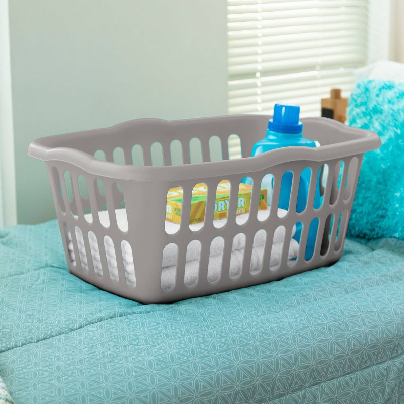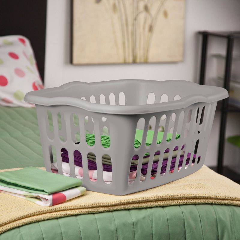 The Sterilite 1.5 Bushel Rectangular Laundry Basket features a classic design, and is a great solution that satisfies common laundry needs throughout the home. The laundry basket includes contoured grip surfaces that add comfort and ease when carrying loads of clothes to and from the laundry room. The integrated handles on all four sides allow for easy lifting and carrying through doorways, hallways, and up and down stairs. The large, oval hole pattern increases air flow for added ventilation and matches any home décor. The smooth plastic interior is snag proof and easy to clean. When not in use, the laundry baskets stack neatly and nest together creating more efficient storage space. The overall assembled dimensions of this item are 24" L x 17 3/8" W x 10 3/8" H.