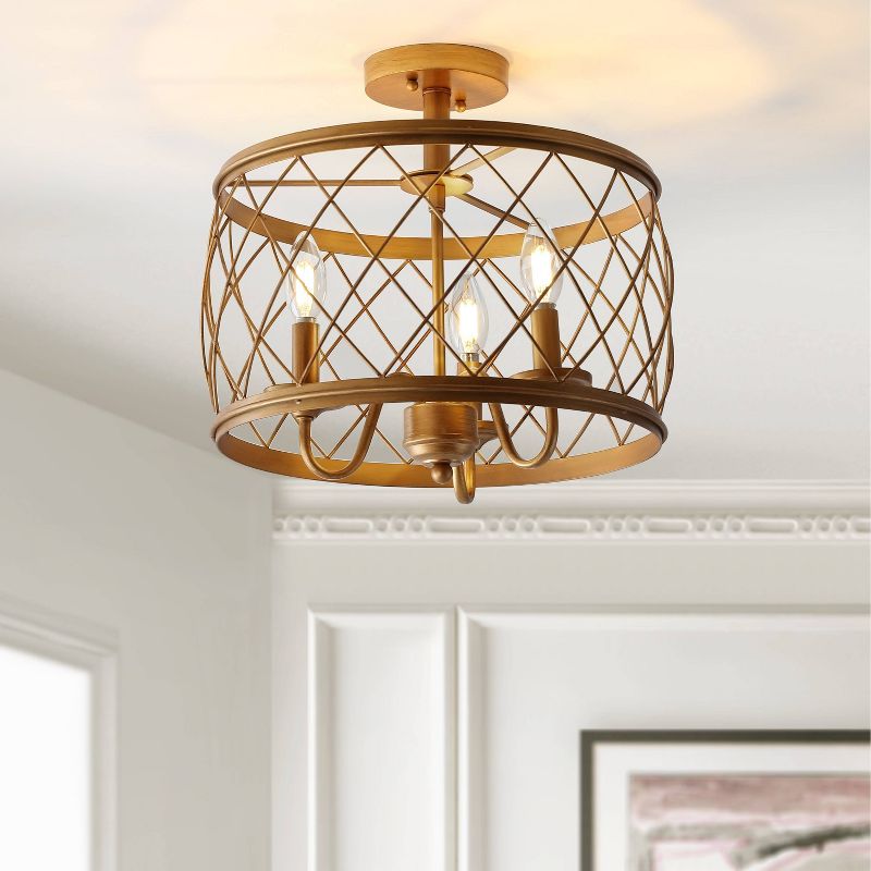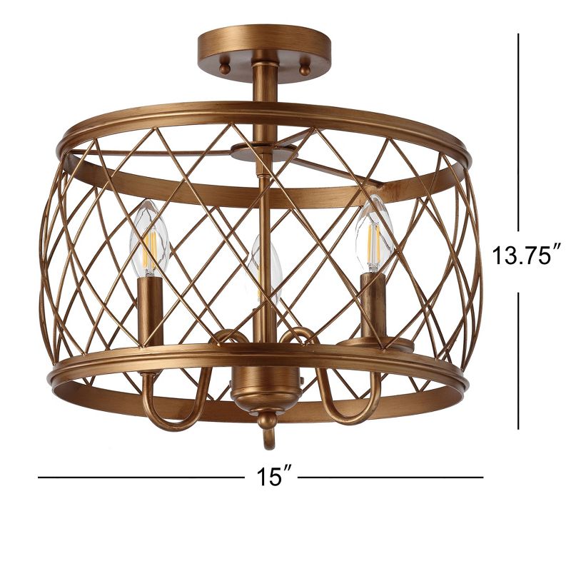 Surrounded by a drum of golden iron, three chandelier bulbs emanate a warm glow, creating a sense of "welcome" suitable to any room in the home. Industrial hardware finds restoration with a fresh finish, creating a look that is rugged but feminine. Easy to assemble, maintain, and clean; this fixture is as functional as it is lovely.