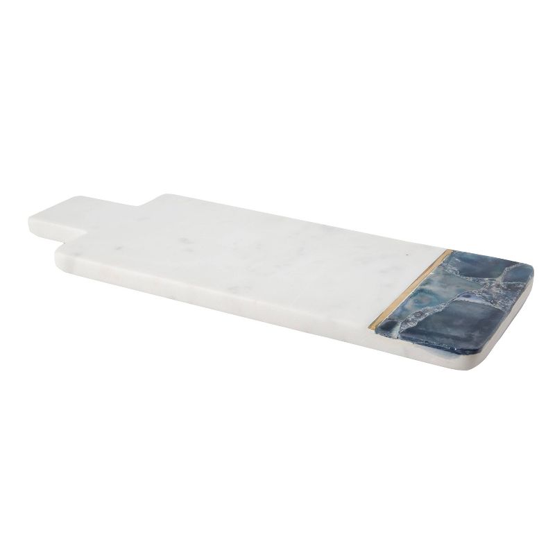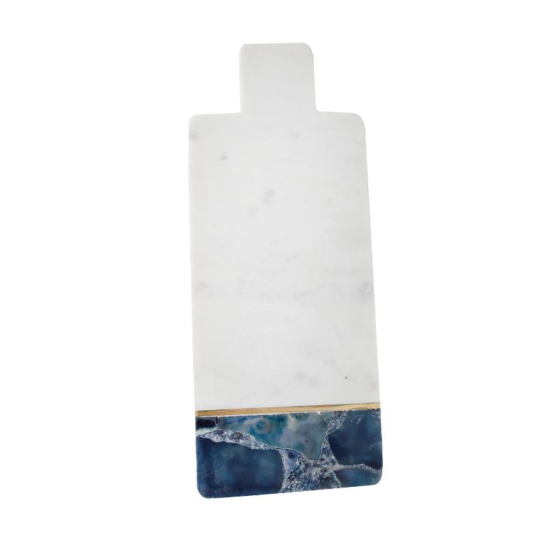 This solid white marble rectangle board with a beautiful inset of classic blue agate and brass inlay accent makes a stunning backdrop for appetizers or desserts.