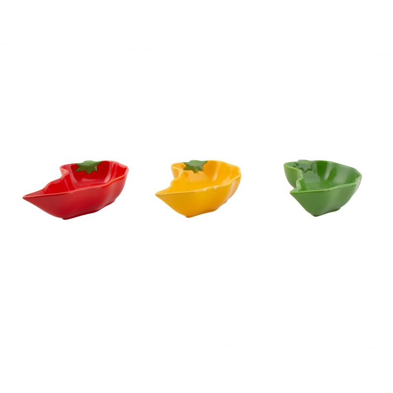 Bold red, green, and yellow pepper shaped set of 3 bowls that will surely spice up your taco night.