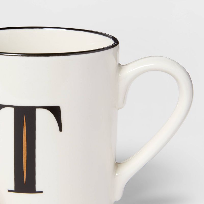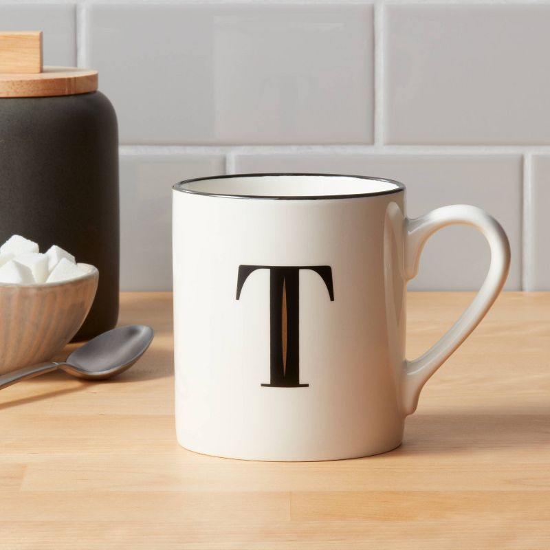 The Stoneware Monogram T Mug from Threshold™ is just the right pick for someone as unique as you. Adorned with the letter "T" written in a black font to represent your first or last name on a glossy-glazed white finish and featuring a contrasting black rim, this letter coffee mug looks stunning resting in your hands or placed on your coffee table, desk or countertop. Made from stoneware for durability and lasting use, and featuring a curved handle for easy grip, this monogram coffee mug features a microwave-safe design that makes reheating drinks easy. Plus, you can simply toss it in the dishwasher for quick cleanup.