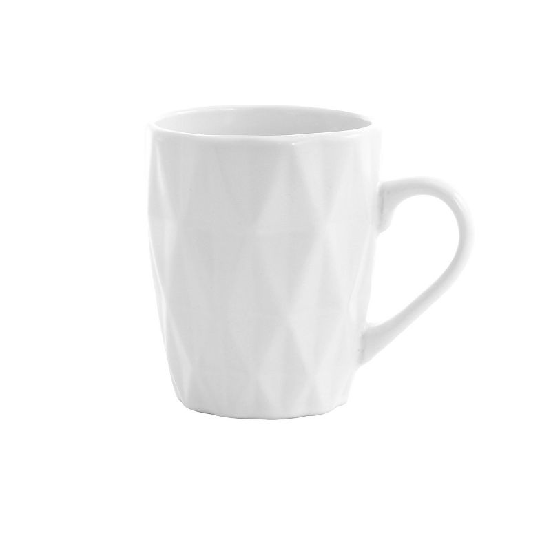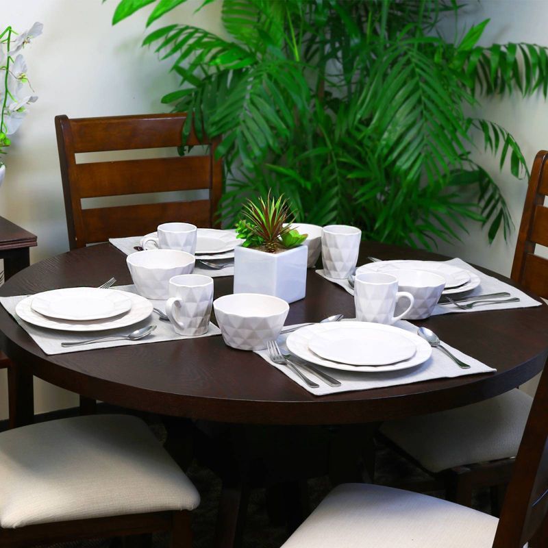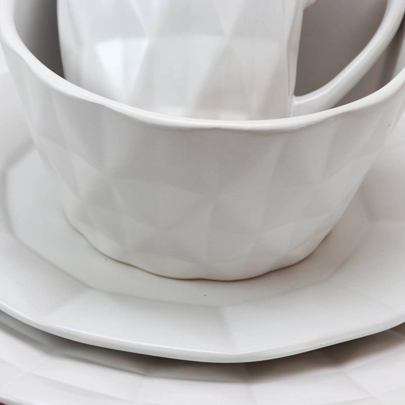 This Elama Diamond Cut 16-Piece Glazed Dinnerware Set in White is a unique collection featuring two highly sought-after looks. The distinctive geometric border set features a reactive glaze that combines beauty and class that's ideal for any tablescape. Ideal for every day casual settings as well as formal gatherings. Crafted from high quality stoneware for a durable and long lasting design.