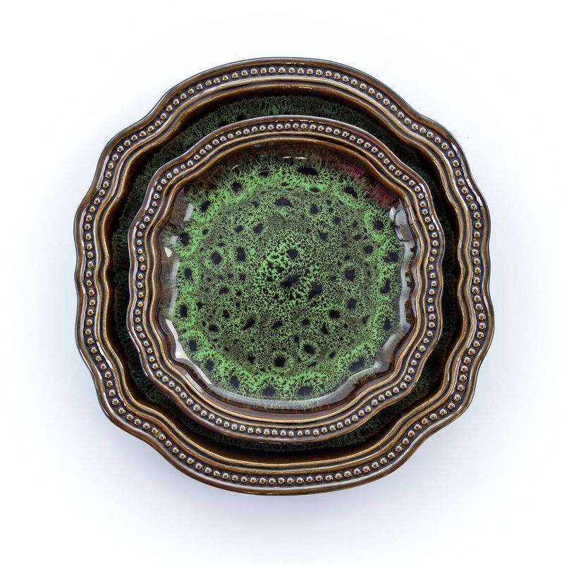 The Elama Jade Waves 16 Piece Dinnerware Set in Green brings a truly stunning accent to your tableware with its unique pattern and texture. The high gloss finish of this luxurious set will tantalize your sense of touch while the bold colors will entice your sense of sight. A textured pattern rim adorning the edges of the dinner and salad plates enhances the luxurious feel of these dinnerware pieces. The same rim runs along the top edge of the mugs to add a special touch complimenting the rest of the set. With a stoneware bowl featuring a matte outer finish which provides you with an delightful anti slip feel, this luxury set is ideal for any occasion from a cozy dinner at home to a large scale event.