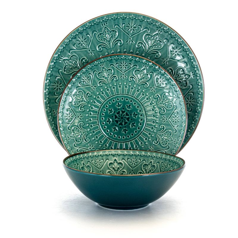 Freshen up your table setting with the textured Elama Teal Mural 16 Piece Round Stoneware Dinnerware Set. With a calming tone of Green and textured mandala style designed plates, this set is ready to make a statement at your next gathering. Ideal for every day casual settings as well as formal gatherings. Constructed from high quality stoneware for a durable and long lasting design.