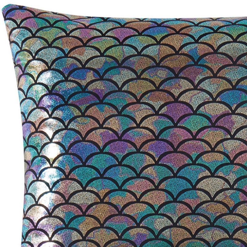 This mermaid inspired pillow is knit using a special technique to give it tons of metallic shimmer and shine. The pillow is filled with 100% polyester fiber filling. Spot cleaning suggested. Face and back is made form 100% microfiber polyester. Pillow is filled with 100% down alternative filling. Spot cleaning is suggested for this item to keep the details fresh and safe from normal washing. Includes one pillow (18x18 inches)