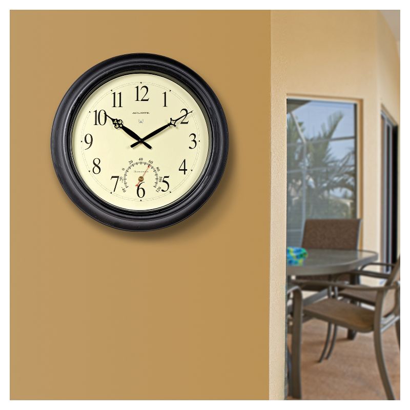 The AcuRite 18 inch Indoor or Outdoor Metal Wall Clock features atomic time and precise, reliable temperature readings. Atomic clock is radio-controlled to maintain the correct time with split-second precision, and automatically adjust itself for daylight saving time (DST). Durable, weather-resistent metal construction is suitable for all seasons - indoor or outdoor use. Includes an integrated hang hole for easy wall mounting. One-year limited warranty. It's more than accurate, it's AcuRite.