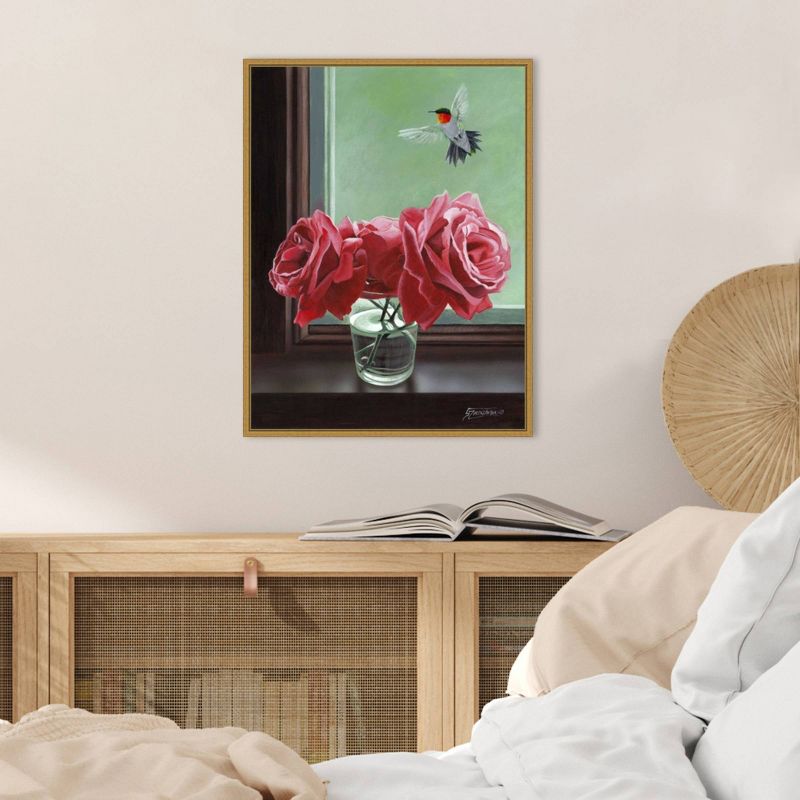 A bird hovers near a small jar of beautiful, red roses that sit on the windowsill. Separated by a pane of glass, all the bird can do is dream about how wonderful they smell and admire their beauty. This Amanti Art Decorative Framed Art Piece is a home decor item you can be proud to showcase on your wall. Our craftsmen handmake this piece in a small custom art and frame shop in America's heartland. We know that each decoration you choose for your home, be it for your living room, foyer, kitchen, bedroom, bathroom or other space, is a reflection of your style and taste. We hope you're pleased with your Amanti Art purchase!