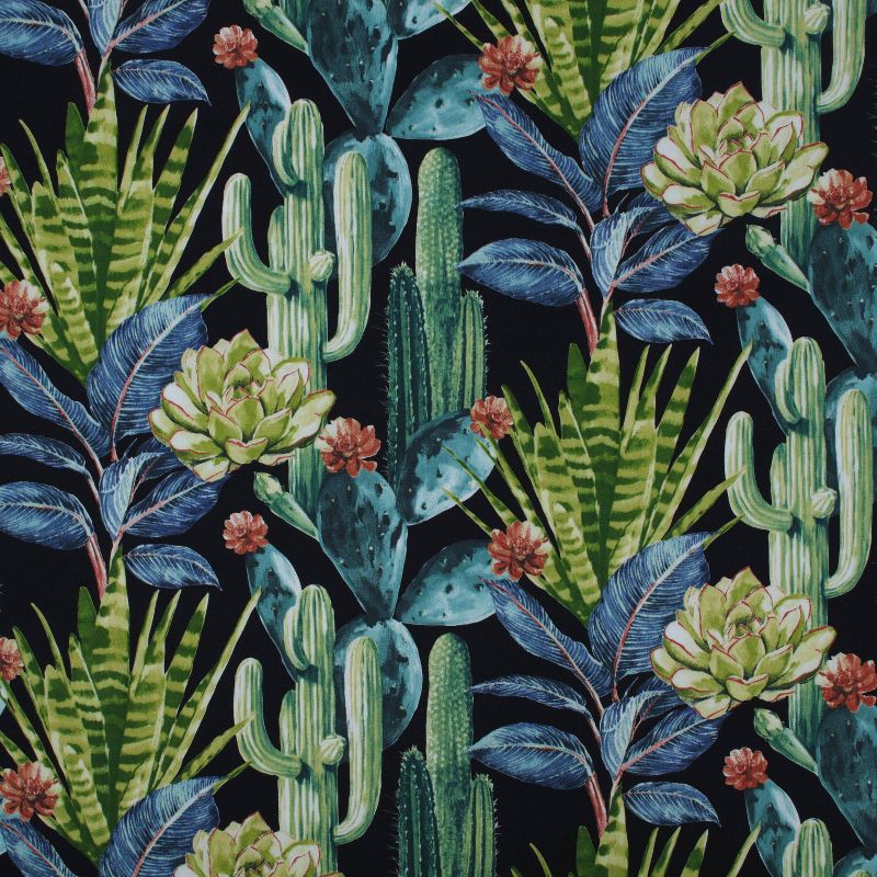 Accent your outdoor escape with decorative pillows in the exotic beauty of cactuses, succulents and greenery. In multiple shades of green, blue, turquoise and red, plants are set against a black background for an on-trend look of splendor. Made of 100% polyester. Additional features of these outdoor decorative pillows include a contrast welt cord for a beautiful finish and recycled polyester fiber fill with a sewn seam closure. Also suitable for indoor use.