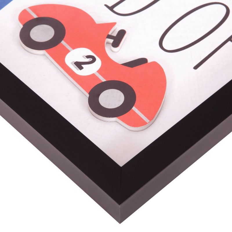 •Graphic art print features a fun and exciting typography design reading "To Fall Asleep I Count Race Cars Instead Of Sheep" and red and blue raised die-cut race cars that add depth and dimension
