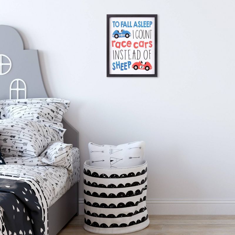 Turn your little one's bedroom into a dream-come-true with this I Count Race Cars 18x22 Framed Print Wall Art. From decorating the new nursery to adding a touch of whimsy to the play room, this baby or kids' wall decor lends delightful layers of color and adorable illustrations. This graphic art print features a fun and exciting typography design reading "To Fall Asleep I Count Race Cars Instead Of Sheep" and a raised die-cut illustration of red and blue race cars that add depth and dimension. Digitally printed artwork is framed in a smooth black gallery frame. Children's' artwork hangs securely to any wall surface with industrial hangers on the back that make installation a snap.