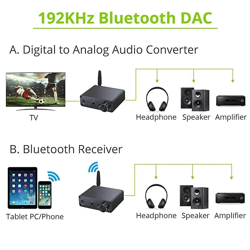 **********192kHz Digital to Analog Converter Converts Coaxial, Toslink Digital Audio or Bluetooth Signal to Analog L/R and 3.5 mm Jack Audio Signal. Built-in high-performance DAC chip, supports 192K/24bit sampling rate. Inculde a 5V 1A Adapter. *****Bluetooth 5.0 wireless Receiver Adopts the latest QCC3008 Bluetooth version 5.0 lossless transmission technology. High quality Bluetooth dedicated antenna for stable signal transmissionNote this item only is Bluetooth ReceiverNot Bluetooth transmitter *****Support Aptx no delay transmission Supports the aptX Low Latency codec, Virtually Eliminate Audio-visual Lag Making an Ideal Choice for Watching TV/Movies. ***** 3.5 mm Headphone Amplifier Support 16-300 Headphone, with Volume Control, Served as Hi-Fi Amplifier, Enable You Experience Home*****Wide CompatibilityBe Compatible with TV Box, Blue-ray DVD, Game Console, HDTV and More, for Either Home or Professional Audio Signal Switching.