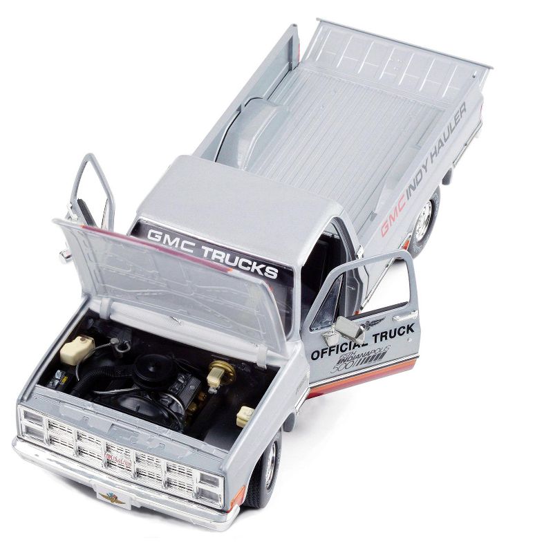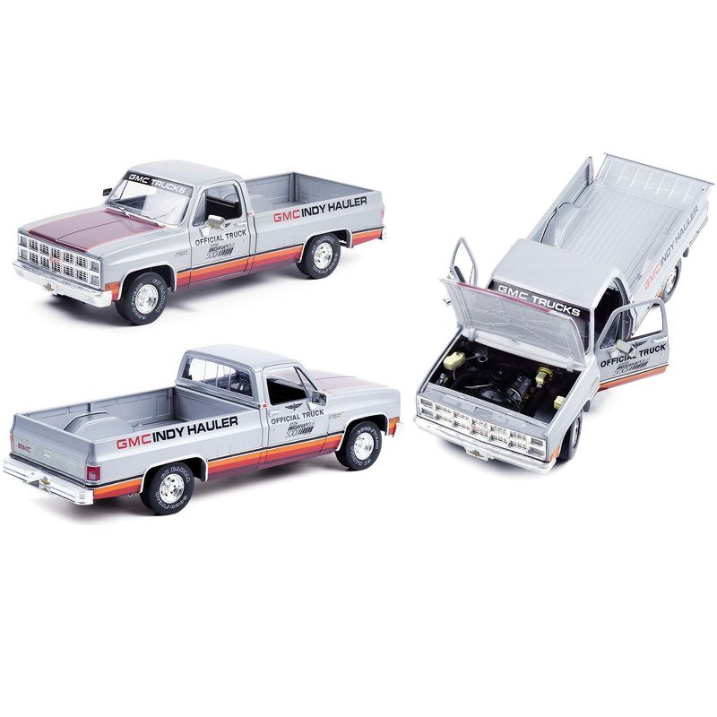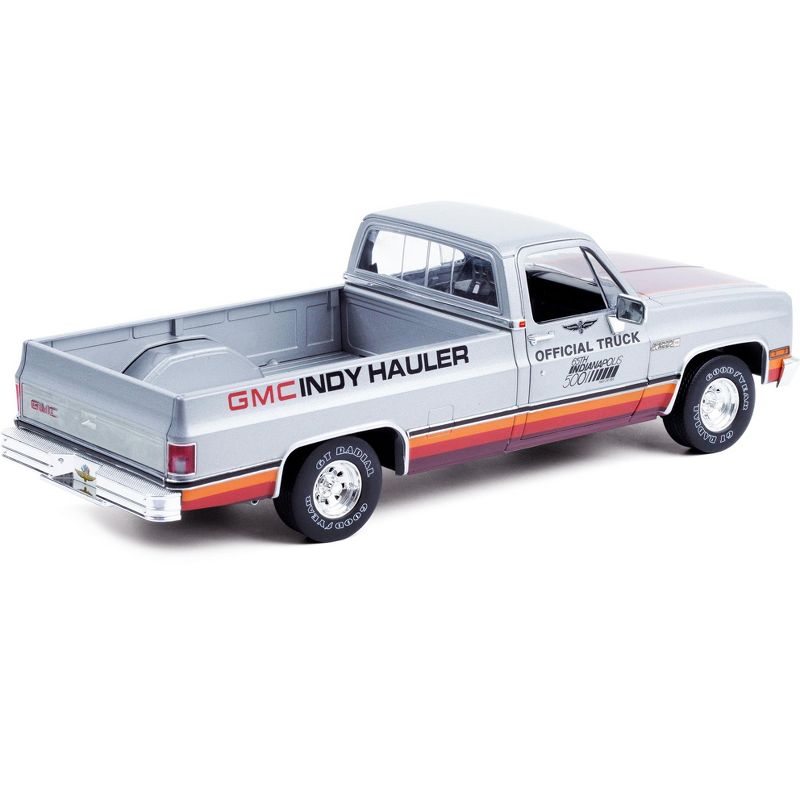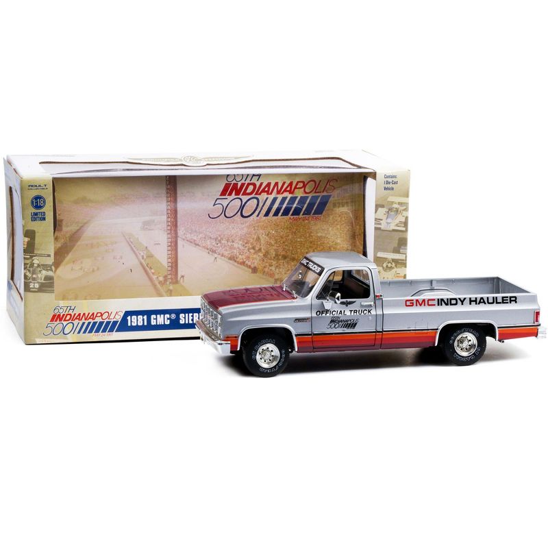 Brand new 1/18 scale diecast car model of 1981 GMC Sierra Classic 1500 Pickup Truck Silver with Stripes "65th Annual Indianapolis 500 Mile Race" Official Truck die cast model car by Greenlight.