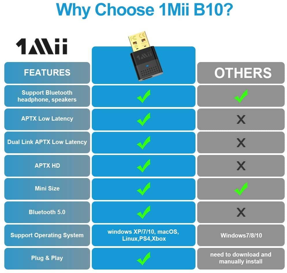 [DUAL AaPTX LOW LATENCY]1Mii Bluetooth adapter can simultaneously connect to two of your headphones/speakers and it supports dual aptX low latency. With this tiny little device, it is very easy to share and enjoy music with your friends. [SUPPORT APTX HD SOUND QUALITY]1Mii Bluetooth transmitter supports aptX high-resolution 48khz music quality over Bluetooth. So whether youre playing games, listening to music, watching movie, youll experience higher-quality sound. [BLUETOOTH 5.0 MUSIC STREAMING]Advanced Bluetooth 5.0 technology enable you quite easily pairing with your Bluetooth devices. Its very easy to add a Bluetooth audio device to your PC, Laptop, Mac, PS4 or switch and steam music to your Bluetooth headphones/speakers.