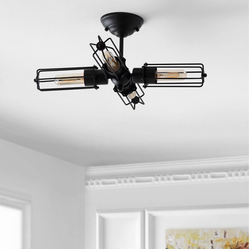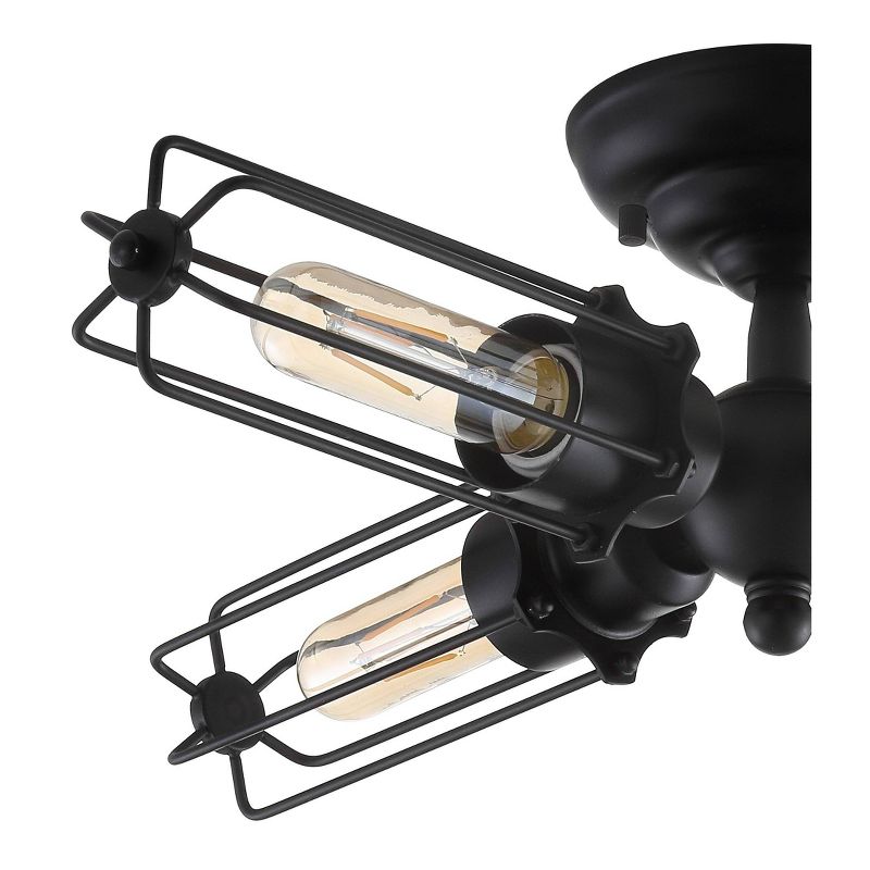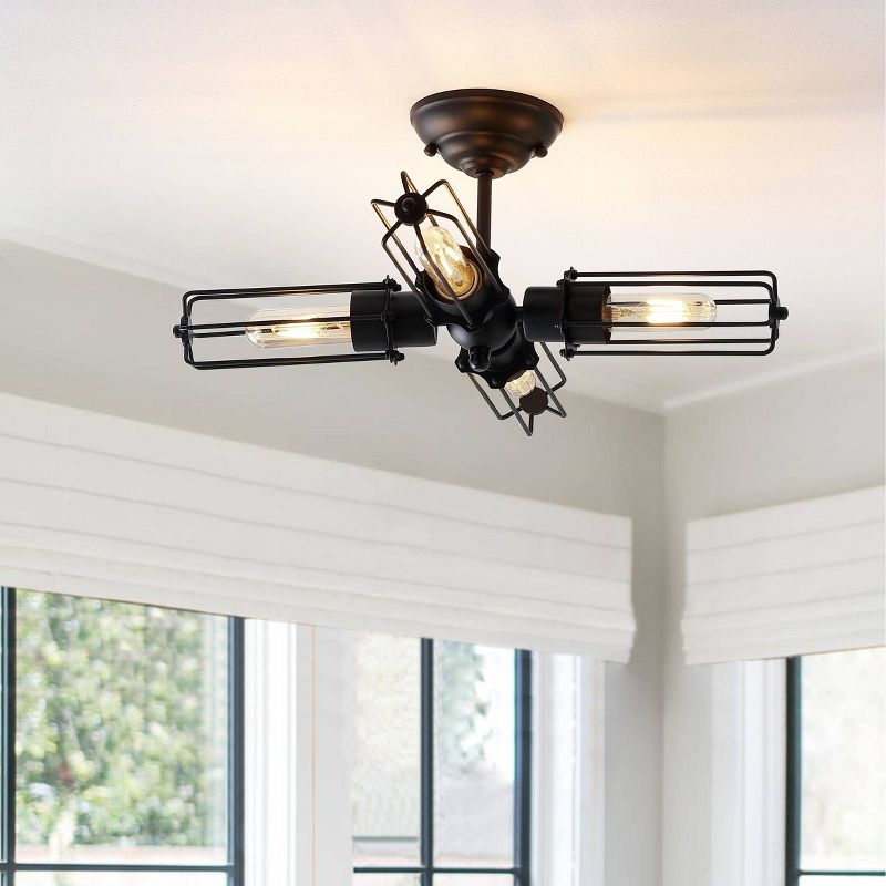 This industrial 4-bulb flush mount features semi-exposed bulbs and a sharp black finish. Its LED-compatibility makes it convenient and energy-efficient. Suitable for low-ceiling spaces at just 9" in height, it provides ample light.