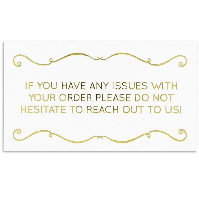 • Double sided cards with "Thank You for Your Order" on one side and "If you have any issues with your order please do not hesitate to reach out to us" on opposite side