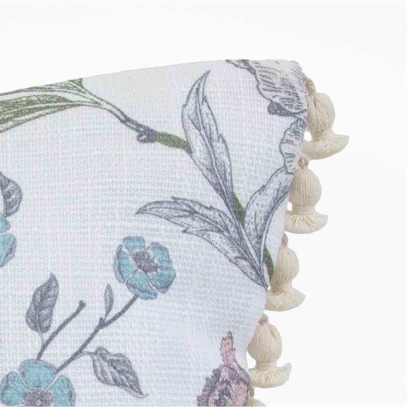 A throw pillow has the ability to awaken a tired living room or elevate the design of your bedroom simply by providing elements of color and texture that weren't there before. You can transform your room into a more tranquil and inviting space with the beautiful Brandy printed faux linen pillow. This pillow is a solid white color faux linen with a soft printed design including birds and florals accented with translucent beads and is finished off with tassels across the top and bottom. This woven faux linen pillow measures a 20x20" square, is feather, has a zipper closure, and can be spot cleaned and air dried as needed.