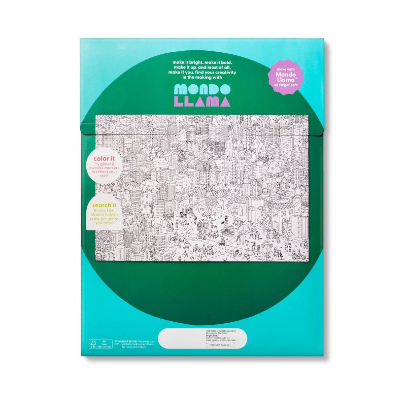 This 22" x 33" Seek & Find Coloring Poster from Mondo Llamaâ„¢ offers multiple fun activities in one. The large rectangular poster features a cute city scene full of buildings, trees, people and more, providing lots of fun shapes to color in with your choice of Mondo Llama markers or colored pencils. Throughout the 22-inch by 33-inch paper coloring poster, surprising objects are hidden so you can also enjoy a search and find activity as you color in the drawing to suit your style.