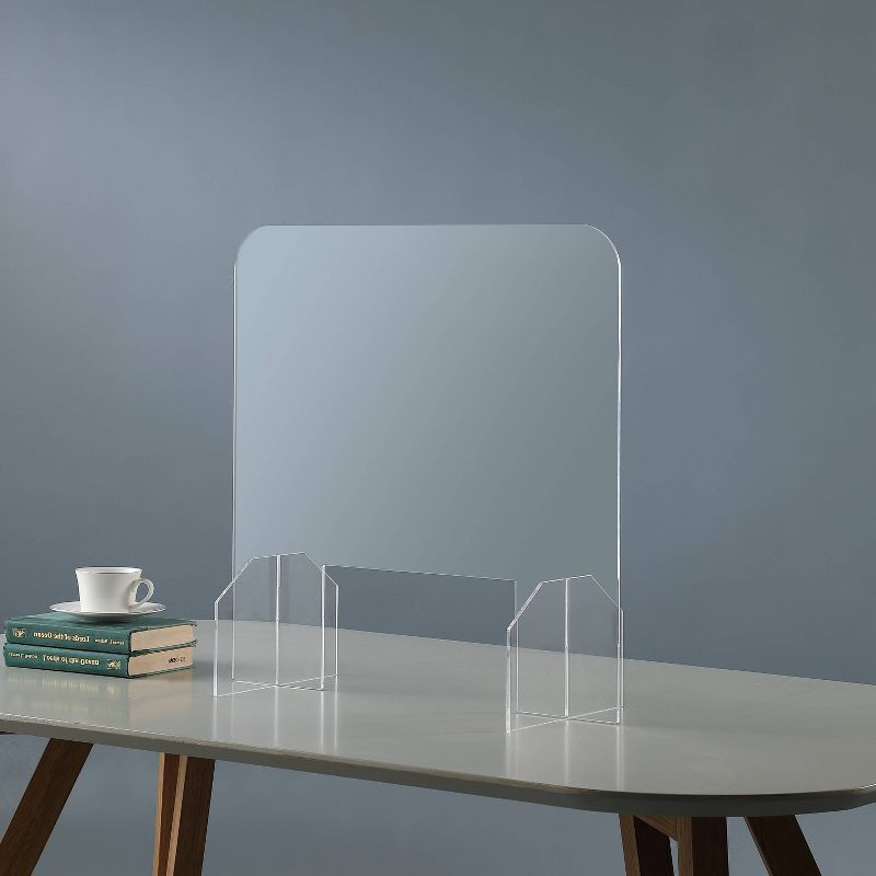 Desktop/Counter Top Square shield guard features a 0.40" (18/32") thick clear acrylic plexi-glass panel. Clear acrylic triangulate legs for stability. Legs lock on to panel so whole unit can be moved without disassembly. A pass-through window at the bottom panel allows for the easy exchange of money, paperwork, and other small items during transactions, check-in, and other interactions. This shield guard is made from materials that are easy to clean with common disinfectants and sanitizers, including 1/8" thick transparent acrylic and easy-to-attach melamine acrylic feet. This unit is easy to move and reposition at any desk transaction or reception area. Freestanding model sits on counter top, offering sneeze guard protection for employees, customers, and students.