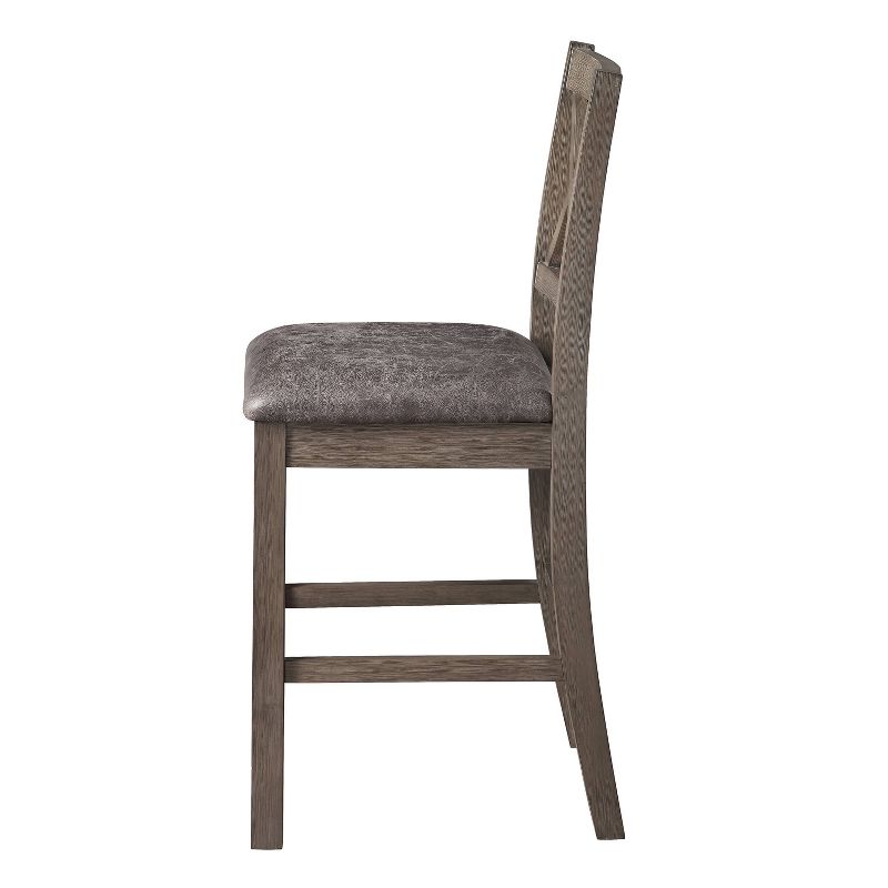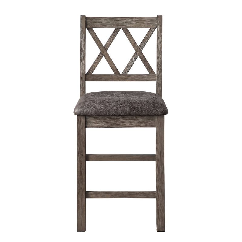 A dusty mocha finish highlights the casual, rustic style of the Lori Counter Chair. The faux-leather seat ensures comfort and is easy to clean. Solid wood stretchers add strength and comfort. The stylish X-back motif and light wire-brushed finish make this the perfect addition to your dining space. Your purchase includes two counter height chairs.