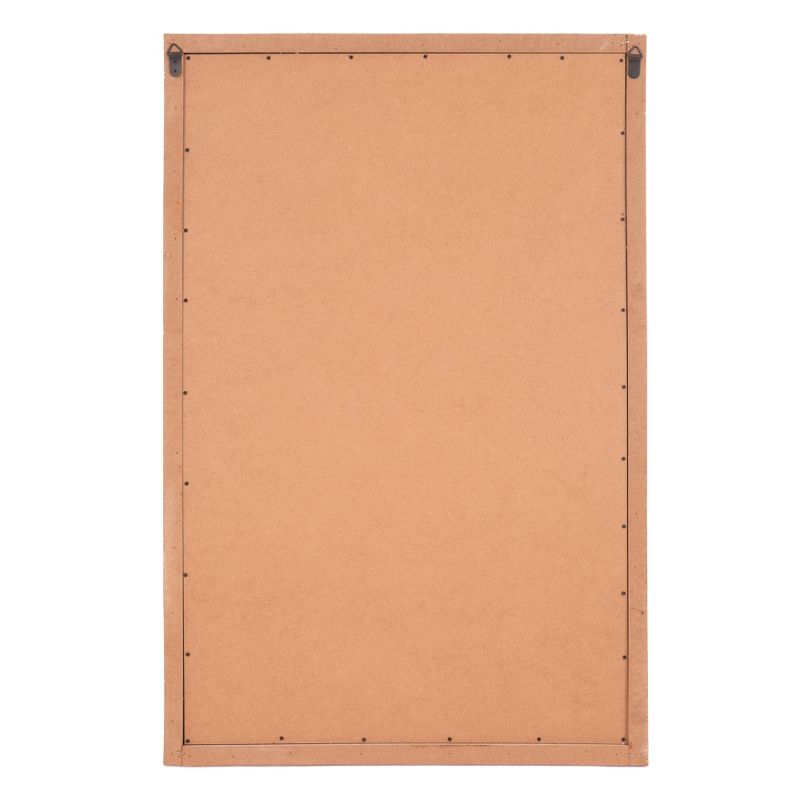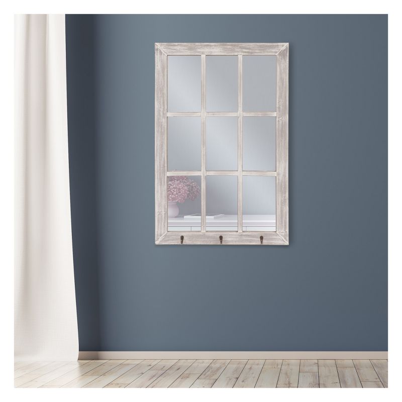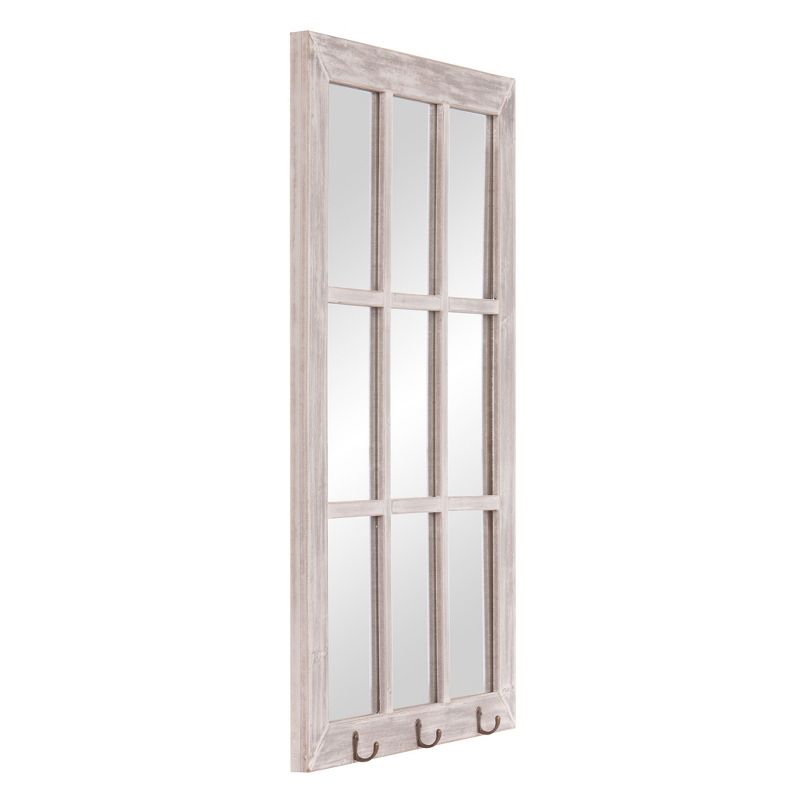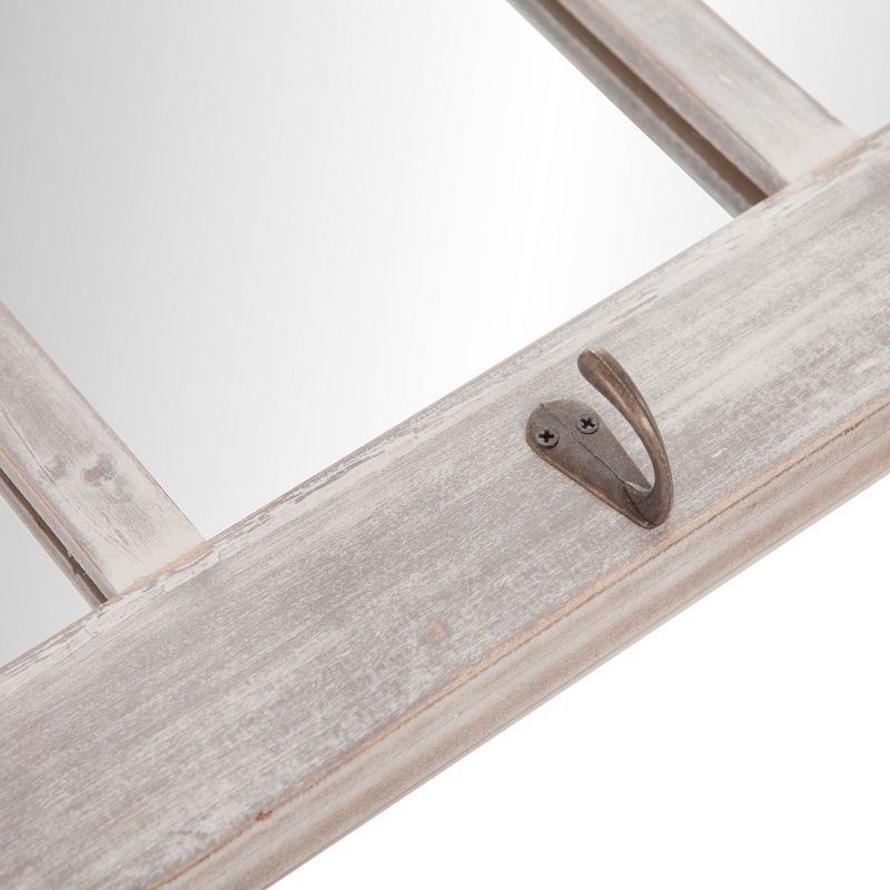 This gorgeous wall mirror brings character and elegance into any decor. Hand crafted from solid wood, this rectangular mirror makes for a classic statement piece. It's design mimics antique windowpanes with metal handles in a black powder coat finish. Hang it securely on a wall with two industrial strength hangers on the back or lean it up against a wall above a mantel. Mirror measures 24 inches high x 36 inches wide x 2.5 inches deep. Frame is finished in an elegantly distressed white finish for a vintage feel and measures 2.55 inches wide. It's cathedral inspired arched design will brighten any room and create the illusion of a larger space.
