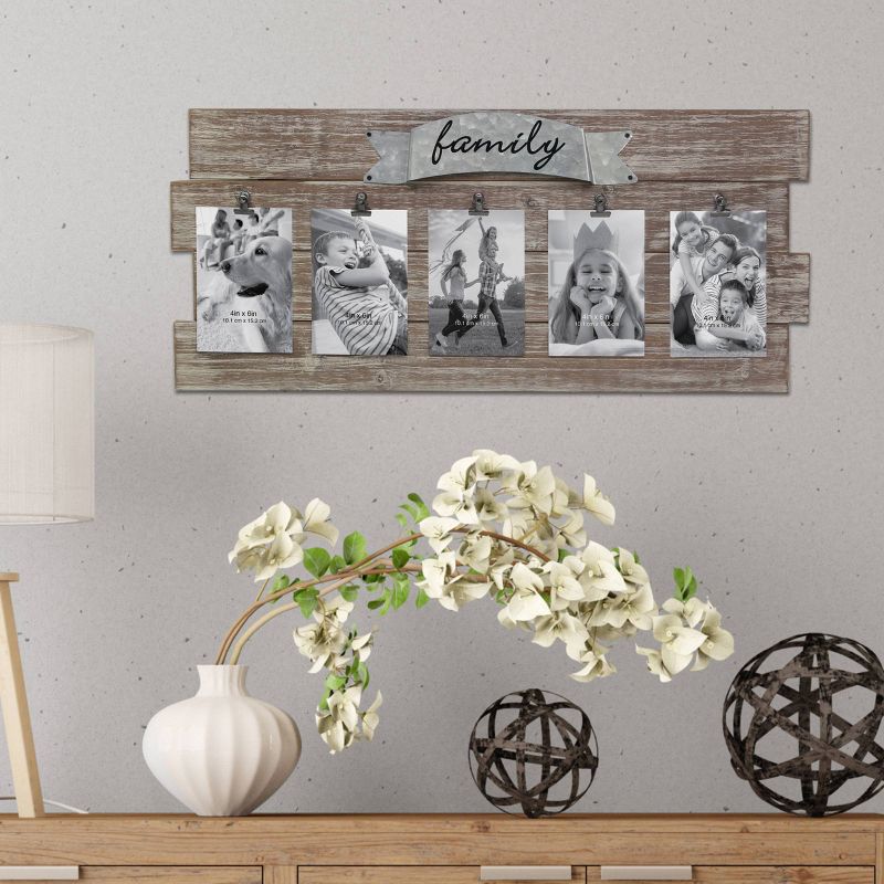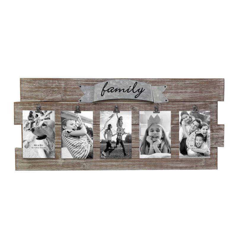 Remember those special moments and enhance your home décor with Stonebriar’s 26.4" x 11.6" rustic wooden collage photo frame with clips. This frame is easily loaded with 5 sturdy metal clips and can fit any 4” x 6” photo, piece of artwork, or document. Frame comes with attached sawtooth hangers for easily installed right to of the box. This wooden clip collage frame is made of distressed natural wood and a decorative galvanized metal trim with the word "Family" printed on the front.