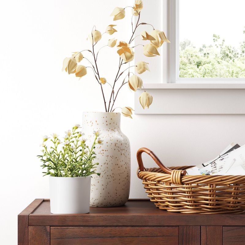 Bring some floral decoration into your home without the maintenance required of live plants with the 28-Inch Artificial Chinese Lantern Spray from Threshold™. This artificial plant decoration looks just like a real Chinese lantern plant, complete with lantern-shaped blooms. The beige color of the blossoms makes the plant easy to incorporate with any decor color palette, and the 28-inch length makes it a piece that's sure to stand out whether displayed on its own or with other artificial flowers. Simply hang it on the wall for an accent piece, or display it in a vase for an alternative to real flowers.
