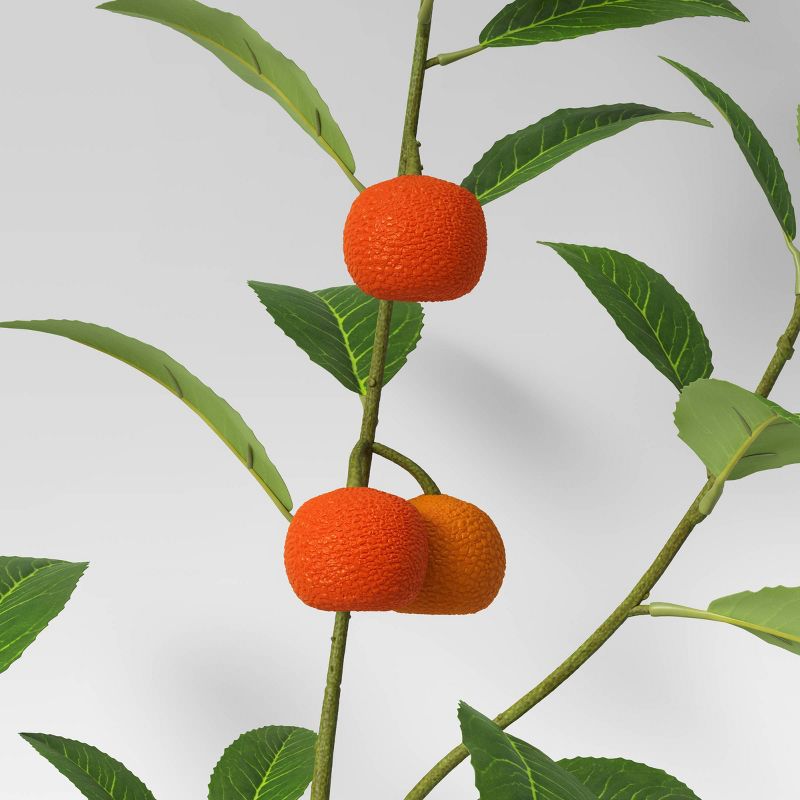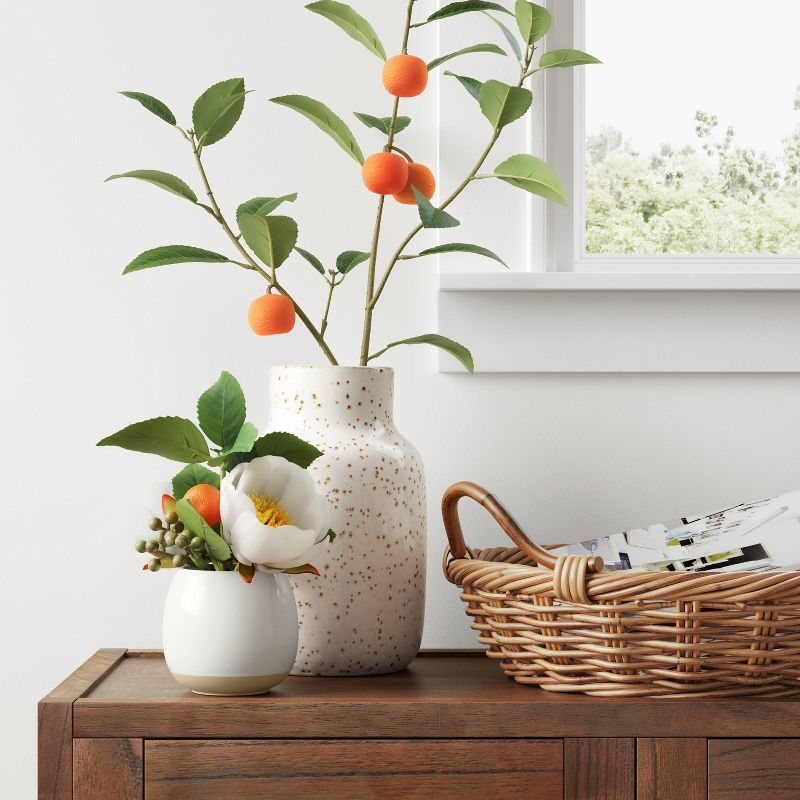 Add a fresh twist to your decor with this Artificial Citrus Plant Stem with Leaves from Threshold™. This decorative citrus plant stem makes a welcoming home accent. It showcases a green stem with vibrant green leaves and faux oranges hanging from it for a refreshing natural look. This artificial plant accent requires no care or maintenance to stay beautiful at all times. Display in jars, tall vases or any other decorative container on a table to instantly refresh your interiors.