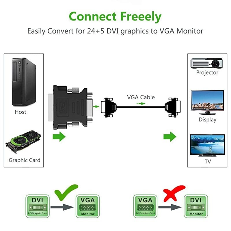 Color: DVI TO VGA Adapter Black DVI-I 24+5 DVI-I Male to VGA female adapter offers you a cost-effective way to connect a HDTV, Projector or Display with VGA to a PC or Mac computer with a DVI Analog Video Card at resolution up to 1080P. The slim DVI & VGA connectors with screws not only support secure connection, but also easy plugging & unplugging. 1. DVI-I 24+5 Male to VGA Female with slim connectors; 2. Supports resolution up to 1080P; 3. Supports analog signal only, and DVI & VGA do not support audio output; 4. Gold-plated connectors to optimize its performance; 5. Compatible with Flat Panel Displays, Digital CRT Displays, Projectors, and HDTV. 6.