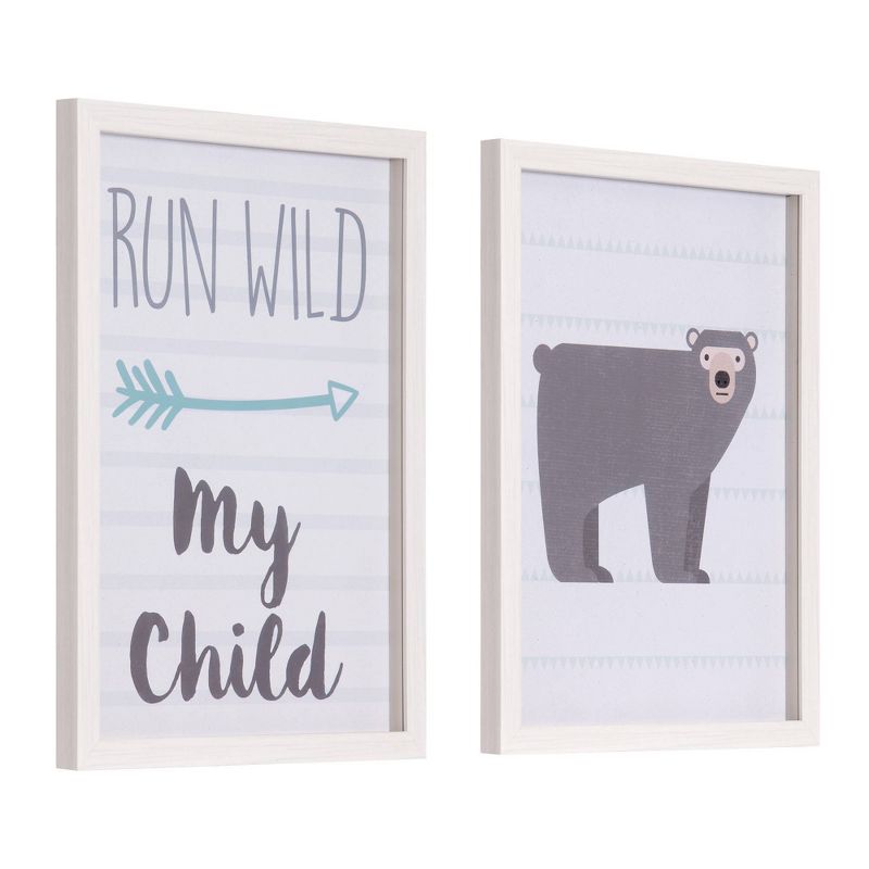 Turn your little one's bedroom into a dream-come-true with this Run Wild My Child 18x26 Framed Wall Art Print Two Piece Set. From decorating the new nursery to adding a touch of whimsy to the play room, this baby or kids' wall decor lends delightful layers of color and adorable illustrations. This graphic art print features a whimsical typography design reading "Run Wild My Child" and a delightful bear illustration lending muted hues of blue and gray. Digitally printed artwork is framed in a smooth white gallery frame. Children's' artwork hangs securely to any wall surface with industrial hangers on the back that make installation a snap.