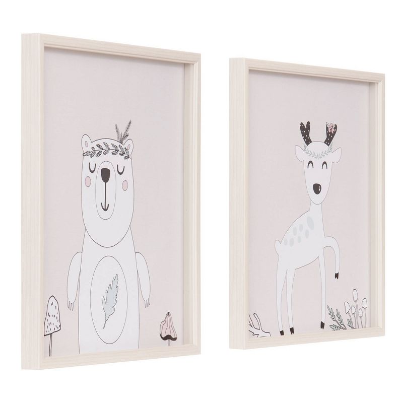 Turn your little one's bedroom into a dream-come-true with this Forrest Animals Illustration 19x19 Framed Wall Art Print Two Piece Set. From decorating the new nursery to adding a touch of whimsy to the play room, this baby or kids' wall decor lends delightful layers of color and adorable illustrations. This graphic art print features a whimsical illustration design of a deer and a bear lending muted hues of pink and cream. Digitally printed artwork is framed in a natural wood grain gallery frame. Children's' artwork hangs securely to any wall surface with industrial hangers on the back that make installation a snap.