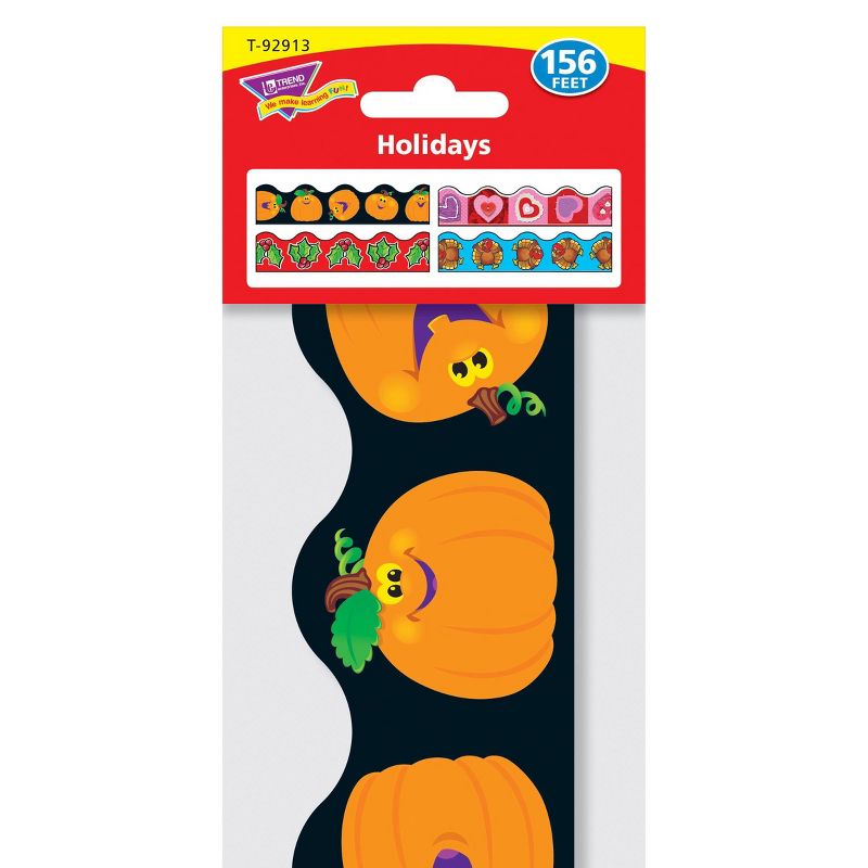 Irresistible designs at your fingertips! Spruce up your spaces and rev up the fun with a convenient Variety Pack of Terrific Trimmers. Vibrant, contemporary designs create cheerful, inspiring classrooms, add pizzazz to parties and events, inspire clever hats 'n crowns, and dress up storage containers, cubbies, and shelves. Layer patterns on solids, sparkles, or metallics for extra WOW! Durable and reusable. Each pack includes Pumpkin Pals, Turkey Time, Holiday Holly, and Scrapbook Hearts Terrific Trimmers. 156' per pack. Sold as 2 packs.