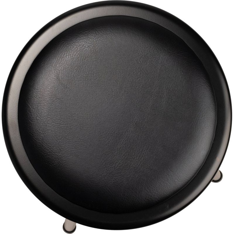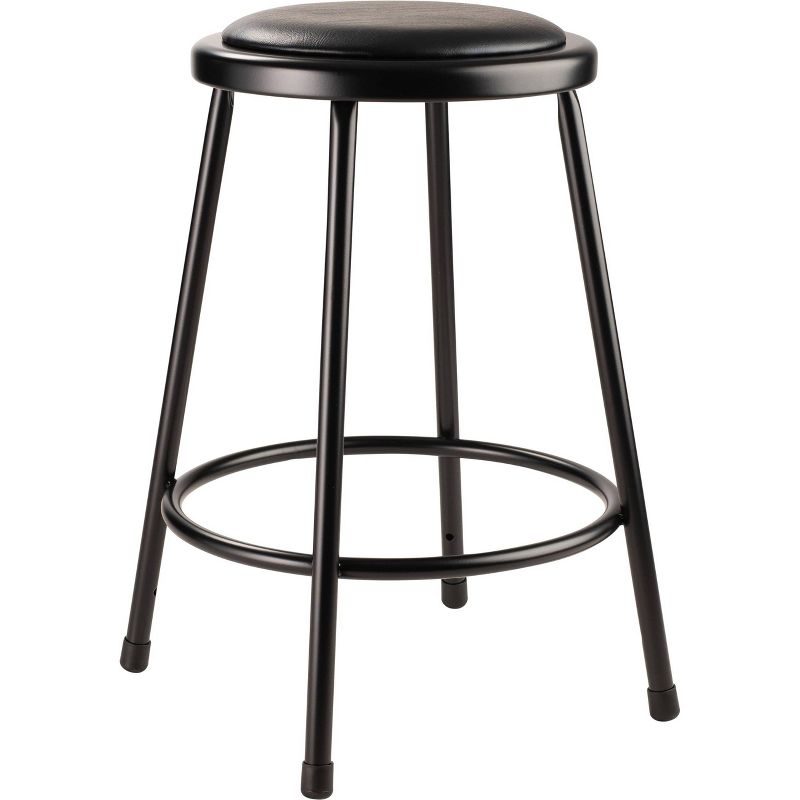 The fortified construction and soft comfort of the 6400-10 Series heavy-duty padded stools are ideal for hands-on educational settings like art rooms, science labs, home economics or shop classrooms. This reliable stool features a strong frame of 18-gauge steel tubing securely welded to a 14" diameter seat pan. Riveted through the steel pan are 1/2" -thick black vinyl cushioning that will provide years of dependable use. Footrest ring is securely bonded to each leg with four spotwell contact points.