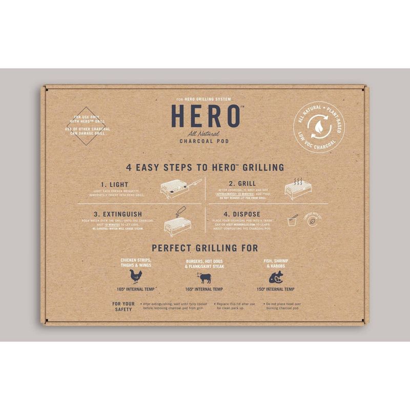 •SAFE PORTABLE CHARCOAL: HERO Charcoal Pods are a safe, portable charcoal option for grilling great food with friends and family. They're vacuum sealed to stay watertight until you use them. Plus, they are quick to extinguish by pouring water over the pod.