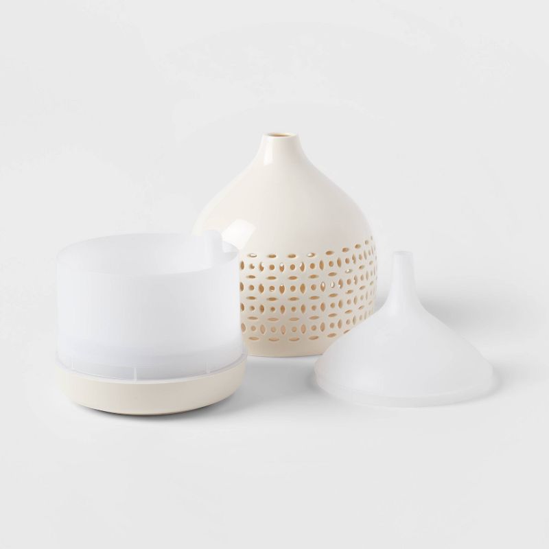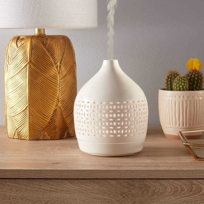 Infuse your home with the appealing scents of your favorite essential oils with the Cut-Out Ceramic Color-Changing Oil Diffuser from Opalhouseâ„¢. Crafted from white ceramic with cut-out detailing for a touch of artisan style, this essential oil diffuser makes an appealing addition to your home decor while effectively diffusing your favorite oils and adding a soothing aroma to your space. The internal light changes color for added visual appeal, and the nine-hour run time with automatic shut-off means you can relax and enjoy your chosen oils without having to worry about turning it off.