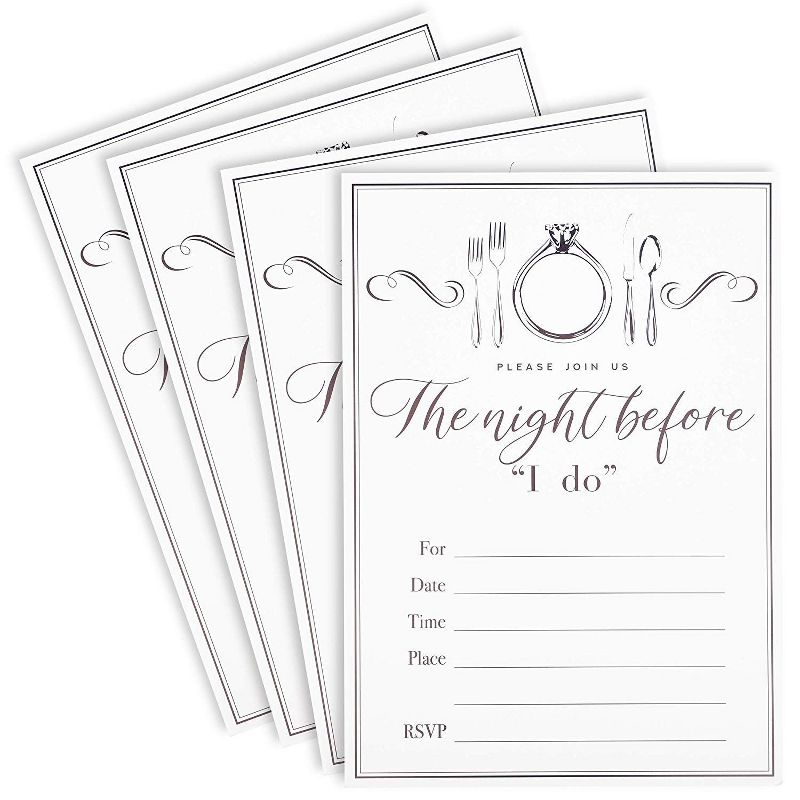 Invite your guests to your wedding rehearsal party with these elegantly designed celebration invitation cards. The white-colored cards have “The Night Before I Do” printed in navy blue color. Cards are made of sturdy 300 GSM cardstock paper and ensure a great writing experience. These wedding rehearsal invitation cards have ample blank space for writing your party details.