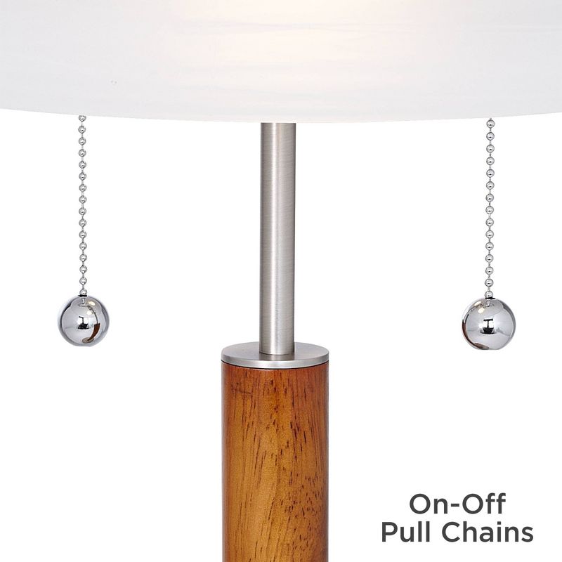 This dome-top table lamp looks great in office settings or as part of a seating arrangement. It features a wood column set on a brushed nickel stand. The white frosted glass shade adds a modern look on top. Control the light output with the twin light pulls.