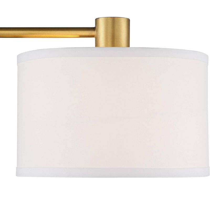• Warm antique brass finish. Metal construction. White linen uno-fitter drum shade. 8-foot long silver cord.