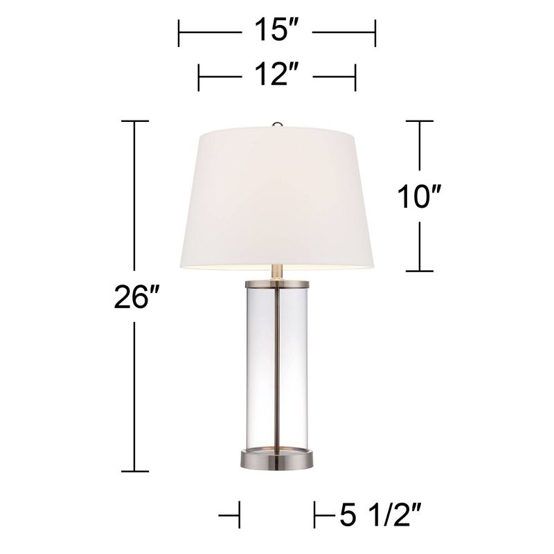 The simple design of this clear glass cylinder table lamp is accented with top and bottom metal trim in shimmering, nickel finish. The lamp base opens, allowing you to fill the glass base with any decorative object of your choosing, such as crystal marbles, shells, or even colored sand. A white drum shade and a steel finish finial top off this distinctive design. This table lamp comes with a brushed nickel universal charging station at the bottom, which can be removed and used with other lamps. The charging station has a built-in USB port and two 2-prong outlets, allowing you to charge up to multiple devices at a time. The back outlet is controlled by a full range dimmer switch.